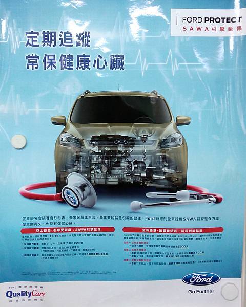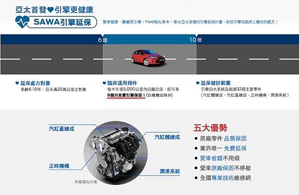 目前小灰3年的新車原廠保固剛過期,看到安心保固專案有點動心,要不要延長保固呢?好傷腦筋啊!~透過朋友的分享,獲知福特正在舉辦「FORD SAWA引擎延保」服務活動,除了可以幫愛車健檢外,還有一些優惠好康,忍不住上網爬文一下: Ford針對車齡6至10年、未滿20萬公里的車主,只要每半年或每5,000公里內回福特原廠進行定期保養,即可立即享有SAWA 6個月的免費引擎保固。